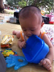 选了个好位置,把东西搬下来,铺好草席。登登,野餐开始了。带娜娜去,我就不太方便下水,所以我就忙着医肚子啦。吃米粉,吃三文治。。。我吃好了就到家仟吃。